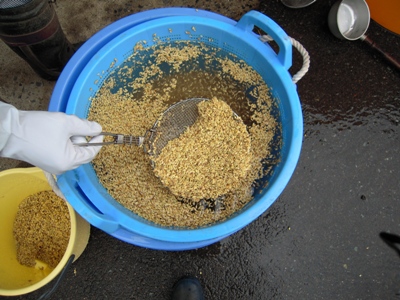 この日は、酒米品種で来年の種子とする「羽州誉」、「龍の落とし子」、「酒未来」、「改良信交」などを塩水選しました。塩水選後は浸種といって、発芽に必要な水分を吸収させるために、10日間ほど水つけしておきます。
