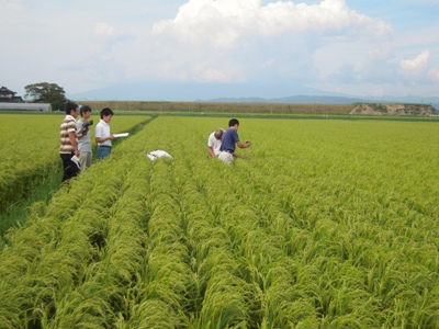 「出羽燦々」、「出羽の里」、そして「京の華」の栽培管理について生産者からの説明を受け、さらに、田んぼに入って、稲の丈と穂の長さ、一穂に着いている籾数の調査をします。