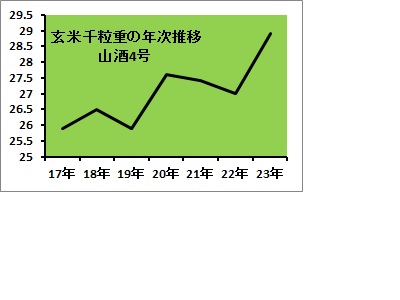 まず、品質で特筆されたのが粒の大きさです。玄米千粒重が平均で28.9gと、これまで7年間の調査のなかで最大です。本年の県産米は、9月上旬の高温による影響もあって、粒は細身で、千粒重は小さい傾向にあります。なのに、研究会の山酒4号はなぜ大粒になったのでしょうか。その要因の一つが、刈り取り寸前までの適切な水管理にあったと考えられます。高温下にあって、田んぼの水を切らさない、これが稲の体力消耗を防ぎ、多照という好条件のもとで、稔りを高めたのではないでしょうか。