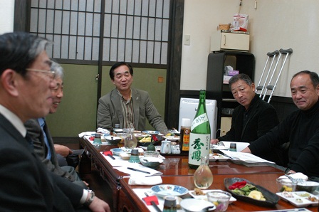 作柄を語る(中央が奥山会長) 山酒4号(玉苗)の純米大吟醸酒を酌み交わしながら