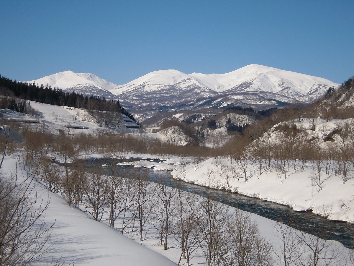 朝日連峰(西川町志津にて) 蔵王連峰と最上川(寒河江にて)