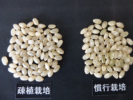 玄米千粒重:疎植が25.6gで慣行よりやや小さめ、