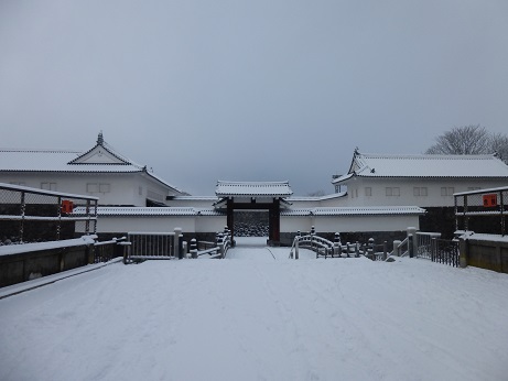 霞城公園 二の丸東大手門と最上義光公像(1月10日)