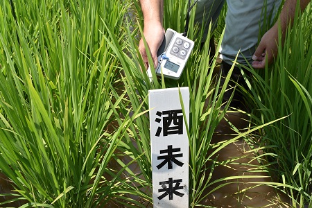 試験田周辺のこの指とまれグループの田んぼには水が張られ、明日から穂肥をするとのこと、量は窒素成分で1.5kg/10aです。量より質、適期・適量の穂肥対応で、より高品質の酒米づくりをめざします。