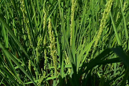 真夏の太陽が照りつけるアスク試験田、出穂は平年より早い