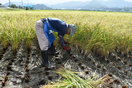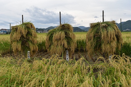そんな中、秋雨の晴れ間を縫って9月5日アスク試験田の刈り取りを行いました。早生品種 「羽州誉」、「龍の落とし子」、「改良信交」、「はなの舞」、「キヨニシキ」、「雪化粧」の原々種です。タネの生産ですので、5日ほどは早めに刈ります。原々種は、基本となるタネです。このため、他品種とは混合しないよう、また株間には異株がないかなど、一株一株目と手で確認しながらの作業です。それだけに手間がかかります。そのうえ、空を気にしながら。刈り取った稲束には品種名を書いた札を付け、杭に架けて20日間ほど自然乾燥します。