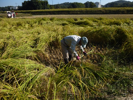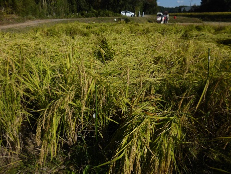 この日の早朝、まだ薄暗い山形を出発、現地に到着したのが14時頃、ASK愛山の原原種は丈の長さに耐えきれず倒れてはいますが、軽いのに一安心。秋の日のつるべ落としを気にしながら、一服する間もなく刈り取りスタート。倒れているため刈りにくいものの、蚊に刺されることもなく、作業は順調に進み、1系統60株ずつ、300株を刈り終えました。