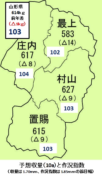 さて、東北農政局山形支局は10月2日、本年度の水稲作柄概況(9月15日現在)を発表しました。それによれば、10a当たりの予想収量は平年より19kg多い614kg、平年を100とした作況指数は103で「やや良」となっています。8月中旬以降、気温・日照時間とも平年を下回り、登熟の進みが懸念されましたが、「平年並み」と見込まれています。