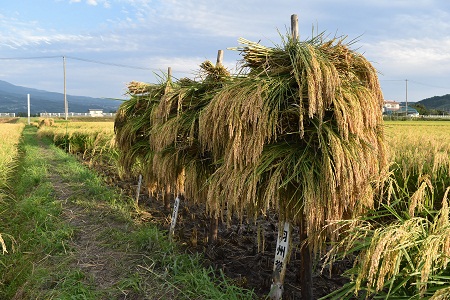 サタケの色彩選別機で選別 精米の袋づめ作業