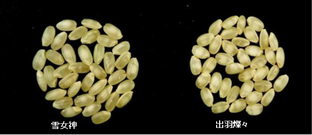 雪女神は、山形県農業総合研究センターで出羽の里を母、蔵の華を父として平成13年に交配、15年にわたって育てられてきました。雪女神は出羽燦々に比較して、