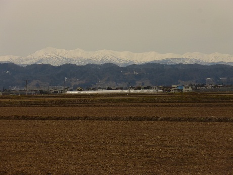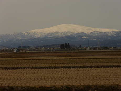 晴れ間に姿を見せた雪女神(3月16日:左が月山、右が朝日連峰、天童市にて)