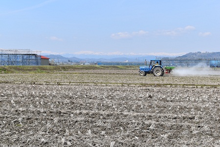 土づくり肥料の散布(左:河北町溝延、右:中山町にて)