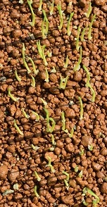 4月15日に播いたタネは、ここ数日の好天に恵まれ、育苗箱の土の中から一斉に芽を出しました。出芽です。出芽から1枚目の葉が出る頃までの成長は、タネ蓄えられている養分に頼っていますが、2~3日もすると根は土から養分を吸い、小さな葉は太陽の光を浴び、自力で成長し、瞬く間にハウスの中は緑のじゅうたんへと変わります。
