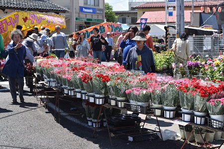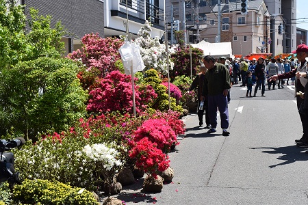 この日は、母の日とあって色とりどりのカーネーションが沿道を彩り、今が盛りのツツジの鮮やかな紅白、松やキャラの緑などなど、真っ青な空の下で映え、行き交う人の目を楽しませています。