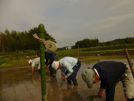 ASK愛山の原々種の苗を1本ずつ植える 田植えを終わって(左から2人目が松本さん)