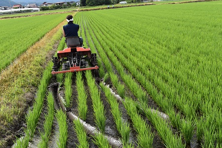 作溝・中干しは、稲を丈夫に育ててるだけではありません。刈り取り作業の効率を高めるメリットもあります。この作業を省いた田んぼは、刈り取り間近に降り続く雨でぬかるみ、稲は倒伏、こうなると大型コンバインといえどもお手上げです。作溝・中干しは、3か月先の稲刈りにも備える優れものです。