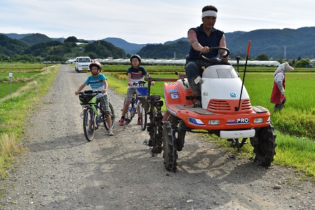 きのうの山形は梅雨の一休み。晴れ間を縫って、「この指とまれ」の平吹正直さんが、アスク試験田と酒造好適米品種の種子田の作溝を行いました。