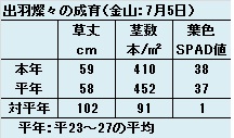 7月に入ってから酒米の里金山は梅雨空が続いていますが、酒造好適米「出羽燦々」の7月5日現在の成育状況は草丈、葉色ともに並み、茎数やや少なめとなっています。葉数は10.5葉、2~3日は進んでいると見込まれます。