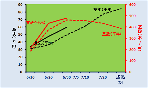 アスク試験田の6月30日現在の成育概況を上の図表に示しました。平年値対比(差)で、草丈は121%と長く、茎数は104%と並み、葉数はプラス0.3葉と早く、葉色はプラス0.2の並みとなっています。6月下旬は気温高く、日照時間は並みで経過したことから、成育は草丈長く、茎数は停滞気味で推移したと考えられます。