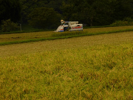 五百万石の刈り取り(南砺市太美にて) 雨雲を気にしながら