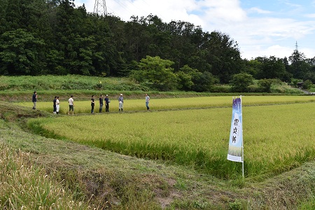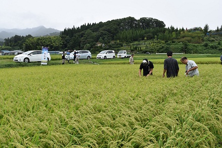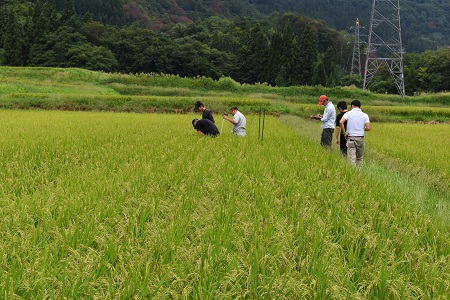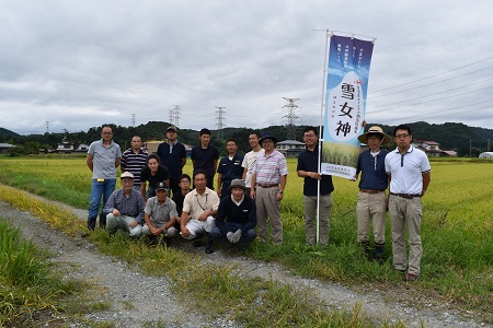 厳しい残暑から一転して肌寒さを感じさせた8月27~28日、県内蔵元の 杜氏さん達の「山形県研醸会酒米研究会」、県工業技術センター、アスクの 15名ほどが、村山地方の酒米産地の雪女神を主体に圃場巡回し、作柄の 出来を確かめ合いました。