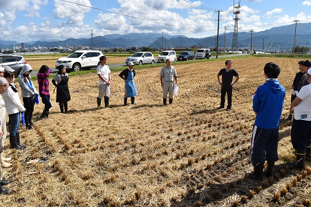 稲刈りを体験したいという飲食店で働く若者たちも加わり、いつになく賑やかな刈り取りです。5アールほどの試験田を1時間ほどで刈り終えました。稲束の大きさと束ね方は様々でしたが。