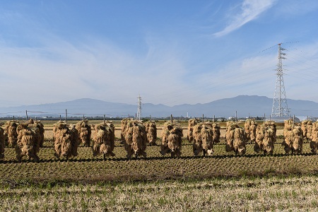 刈り取りを終えて広々と続く田んぼに、忘れ去られたように棒稲架(はさ)が晩秋の陽を浴びて立ち、老夫婦が稲束の架けかえをしていました。「俺のコメはほんとうに旨いんだ」と自慢しながら、「戦後の大変な時に親父がこの田んぼを手に入れたのよ。俺の代で潰すわけにはいかないべ。大変だけんど、こうしてコメづくりを続けているんだっす」。