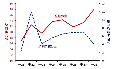 玄米千粒重:25.9g(26.6g) 整粒歩合77.9%(73.1%)