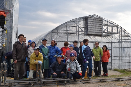 播種を終えた育苗箱はハウスに置床し、苗の葉が1枚ほど出そろうまでマットで保温します。今日播いたタネは5日もすれば白い小さな芽が一斉に顔を出します。出芽と呼んでいます。これから5月中旬の田植えまでの1か月間、保温、灌水など春の変わりやすい天気に気を遣いながら、こまめな管理が続きます。