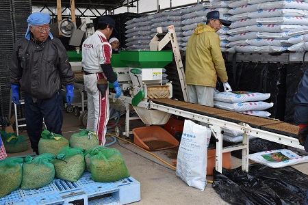 平吹さんたち山形ハーベストは酒造好適米品種、「羽州誉」・「龍の落とし子」を総勢20名ほどの人海戦術でたちまちのうちに終了させました。山口さんは、両親と一緒に「酒未来」を播きました。山口さんは、家族労働でも効率が上がるよういろいろと創意工夫を凝らしています。