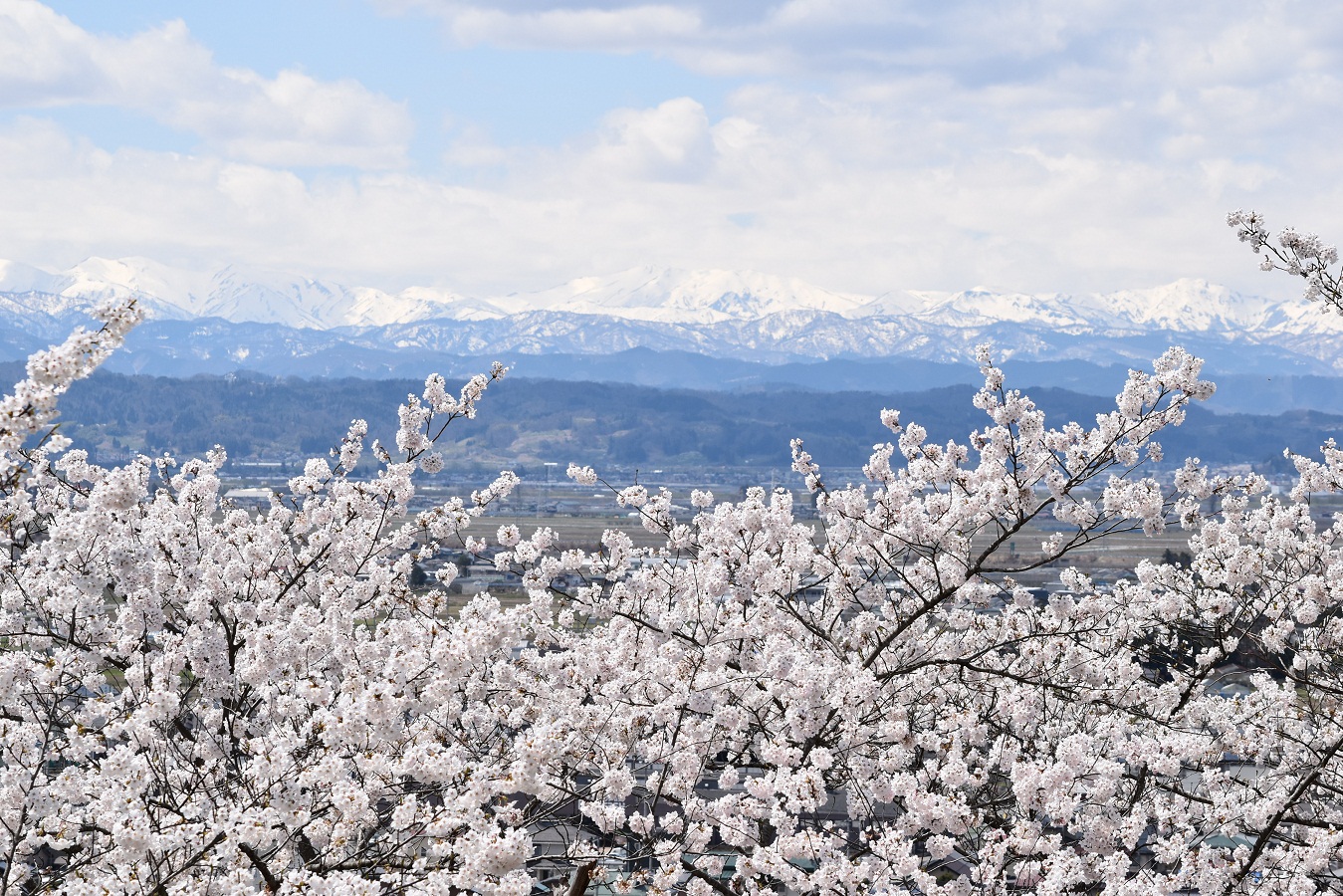 満開の桜と青空に映える朝日連峰(天童市舞鶴山公園にて)