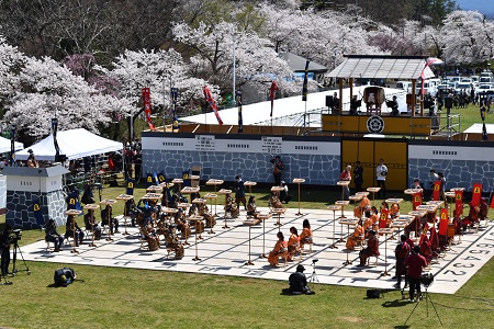 青空に映える残雪の朝日連峰と満開の桜の下で繰り広げられる人間将棋に多くの観客が熱戦を楽しんでいました。