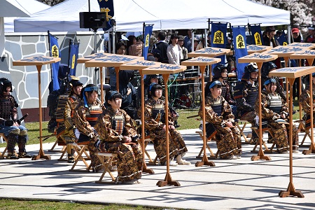 人間将棋は将棋の町天童市の春爛漫の風物詩、地元高校生が扮する甲冑姿の武者を駒に見立て、女流棋士が対局。約15メートル四方の盤上で駒がぶっつかり合います。