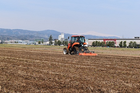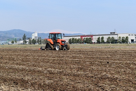 24、25日は春うらら、山形市郊外の田んぼでは残雪の月山を眺望しながら春耕が始まりました。この指とまれの平吹正直さんも酒造好適米「羽州誉」を作付する約2ヘクタールを耕起、広々と広がる田んぼに大型トラクターのエンジン音が響いています。