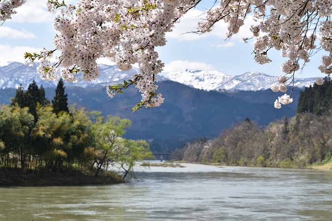 桜の下を滔々と流れる(大石田町にて、4月28日) 桃花映える(後方は蔵王 4月28日)