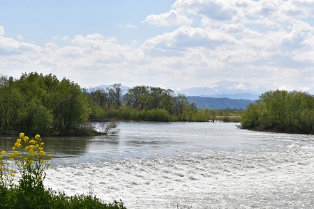 寒河江川が注ぎ、川幅は一気に広がる(天童市にて、左:朝日連峰、右:月山 4月28日)
