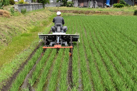 そこで、無効茎の発生を抑え、根の健全な成育を促すため、いったん水を落とし、田んぼの数か所に溝を掘る「作溝」を行います。その後、10日間ほどは水を入れず、小ヒビがはいるぐらい乾かします。中干しと呼んでいます。中干しで稲の葉は黄色味を帯び硬くなり、根は下へと深く伸びます。