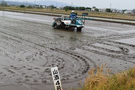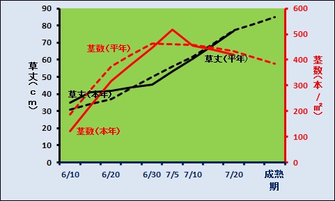 さて、暑さの生育への影響は?、第5、第4節間と呼ばれる株元の下位節間が伸びすぎるのでないかと心配しています。下位節間は、イネ体を支える下半身のようなもの、伸びすぎると下半身は柔らかくなり、倒伏抵抗性は弱くなります。かつての品種ササニシキがそうでした。現在の品種「はえぬき」、「つや姫」は丈が短いのでこの心配はないと思います。また、酒造好適米「出羽燦々」も丈が長くその懸念はありまりますが、主要作付地の金山は、最高気温は高いものの最低気温が20℃を切っており節間の伸長は平たん部ほどではないと思っています。暑さが早く治まり、この心配が杞憂になることを願っています。