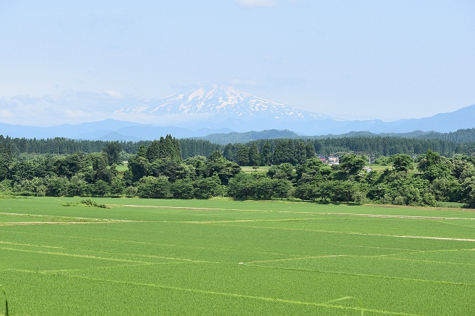 一段と緑の濃さを増した田んぼに鳥海山がくっきり。