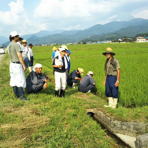 最高気温35.3℃、猛暑日の7月11日、JA新庄もがみ酒米研究会”ゆびきりげんまん”(代表指村貞芳さん)14名と、JA,アスクの関係者が酒造好適米「出羽燦々」、「美山錦」、「雪女神」の青田を巡回しました。メンバーがお互いの田んぼを見て回り、穂肥(出穂前25~20日の追肥)の適期を判断します。