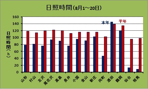 8月に入ってから山形も日照不足が続いています。県内の8月1日から20日までの日照時間の積算値を平年値と比較すると、村山地方が70%ともっとも低く、次いで、置賜地方で75%、最上地方(最上町除く)84%、庄内地方97%となっています。庄内はほぼ平年並みなのに対し、宮城県境の最上町は46%と低い状況です。もっとも、太平洋岸の仙台市が14%、相馬市が9%、というのに比べれば山形県は別世界とも言えるでしょう。もし、この気象が7月だったら!、平成5年の冷害の再来になったかもしれません。