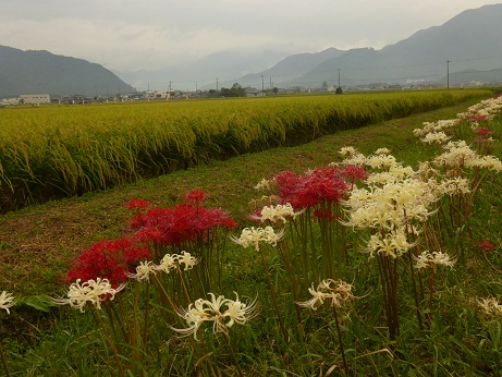 酒造適米山田錦発祥の地兵庫県多可町、小雨降る里に咲き乱れる曼珠沙華、そして黄金色に染まる田んぼに立つ”秋田村”の幟がひときわ目立ちます。