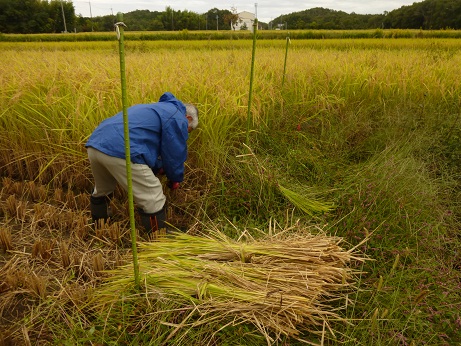 小雨の降る中で"ASK愛山"の原原種刈り取り
