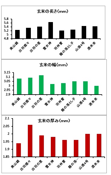 玄米の長さは、雪女神がもっとも長く5.65mm、次いで山形酒4号、酒未来、もっとも短いのが羽州誉です。玄米の幅は、出羽の里がもっとも広く3.13mm、次いで出羽燦々です。そして玄米の厚さは出羽燦々が2.07mmで他品種に比べ厚いことを示しています。