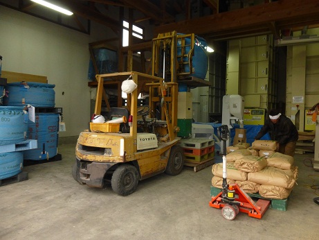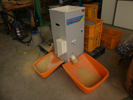 種子調製の施設は、写真からもわかりますように、二人が創意工夫を凝らしたものです。モミが300~500kg入ったフレコンを持ち上げるフォークリフト、モミの芒(のげ)、枝梗(しこう)、ワラ屑を取り除く脱芒機、充実したモミを選別する回転型選別機、昇降機、秤などをつなぎ合わせ、効率的に作業を進めています。もちろん、一品種が終えるごとに入念な掃除は欠かせません。根気のいる作業が4日ほど続きます。