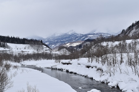 寒河江川から月山・湯殿山を眺望(2月23日 西川町大井沢にて)