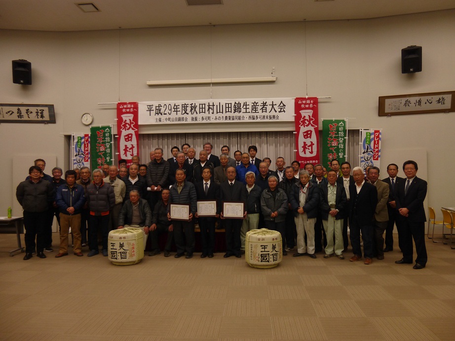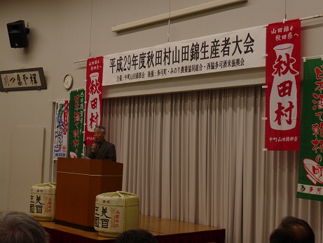兵庫県のど真ん中、山々に囲まれた多可町は酒造好適米「山田錦」の母方「山田穂」誕生の地、そして日本酒で乾杯の町です。この多可町で3月1日の夕方、第7回秋田村山田錦生産者大会が開かれました。