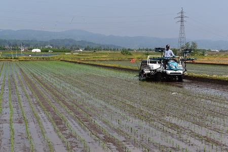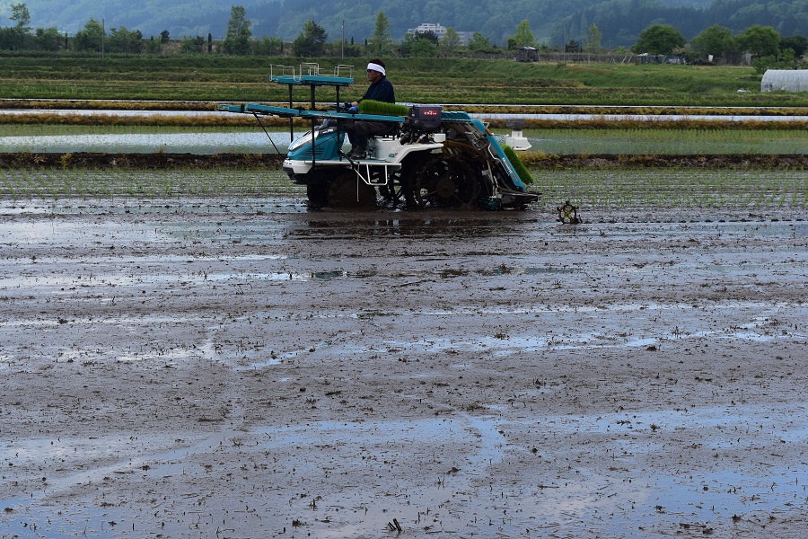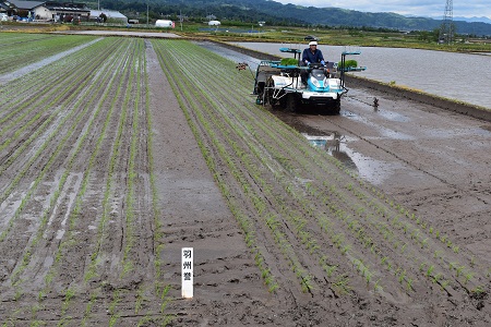 この指とまれグループの山口泰弘さんと、平吹正直さんが、酒造好適米品種の種子田の田植えを行いました。5月14日は、平吹さんが「羽州誉」、「龍の落とし子」、「改良信交」の30アール、同15日には、山口さんが、「山酒4号」、「はなの舞」、「キヨニシキ」の80アール、八条田植機が軽快なエンジン音を響かせ、整然と植え付けていきます。