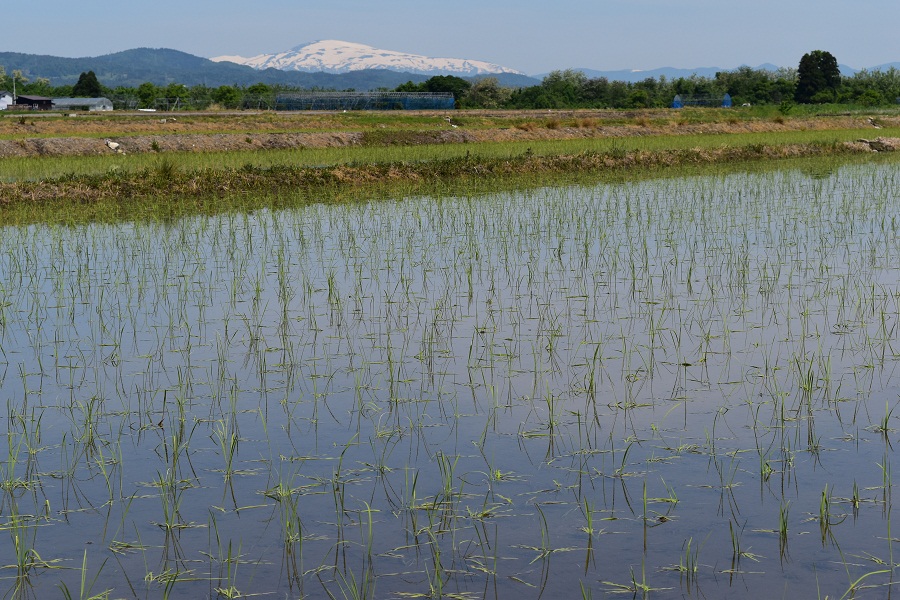 ここ数日、山形の空は真っ青に晴れ上がり、残雪の月山が姿を見せ爽やかな日和に恵まれています。この天気の下で田植えは急ピッチに進み、この指とまれの平吹正直さんの田植えは今日で終わりとのこと。雪解けを待ってのくろぬりに始まり、播種、耕起、代掻き、そして田植えと休むことがなかった約2か月間、ご苦労様でした。
