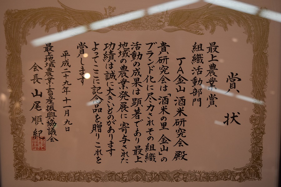 JA金山酒米研究会(会長 松澤信矢)が、”酒米の里金山”のブランド化、酒米づくりでのグローバルGAP団体認証などが評価され、昨年の11月、栄えある最上農業賞を受賞しています。受賞式で松澤会長は「・・・・・タンパク質含量を念頭に置いた栽培や大粒生産のため、G網(2.0mm)からA網(2.1mm)への切り替え、登熟を良くするためのケイ酸資材の投入など、・・・・・”ギャップってなんや”から始まって、”なんぼ高く売れるなや”、”ほんだぁめんどうくさい”と言われながら、当時酒米づくりでは唯一というグローバルGAP認証にこぎつけました・・・・」と述べています。
